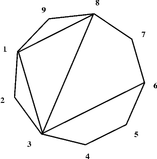 Cztery przekątne 1-8, 8-3, 3-1 i 3-6 dzielą wielokąt