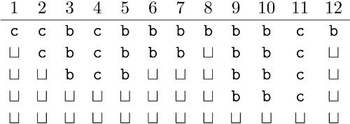 Kolejne litery napisu określają kolor kolejnych klocków: b - biały, c - czarny.