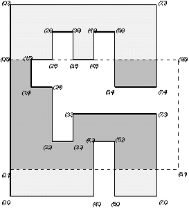 W prostokątnym układzie współrzędnych dany jest wielokąt o bokach równoległych do osi układu. Każde dwa kolejne boki w tym wielokącie są do siebie prostopadłe, a każdy wierzchołek ma współrzędne całkowitoliczbowe. Dane jest również okno, czyli prostokąt o bokach równoległych do osi układu. Wnętrze wielokąta (ale nie jego brzeg) zostało pokolorowane na czerwono. Jaka jest liczba rozłącznych czerwonych fragmentów wielokąta widzianych przez okno?
