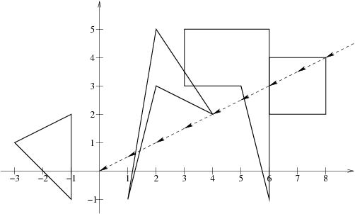 For the sake of simplicity, we assume that every cloud is a polygon (containing its periphery), whose vertices have integer coordinates. This polygon does not have to be convex, but no two of its edges cross each other (with exception of the common endpoints of consecutive edges). The clouds may intersect.