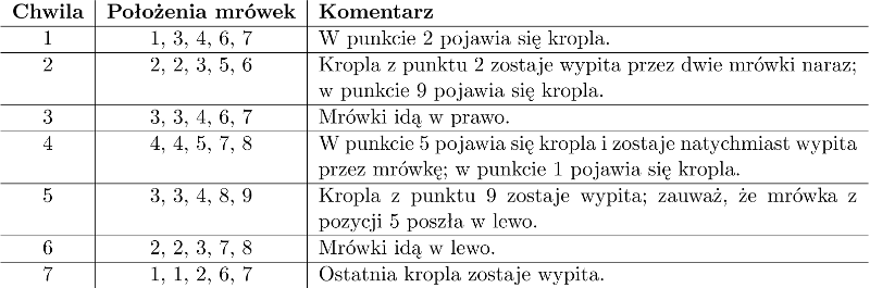 Zauważ, że wypicie kropli może zmienić sposób dalszego poruszania się mrówek. Jeśli do kropli jednocześnie dotrze kilka mrówek, mrówki dzielą się wodą z tej kropli po równo (i natychmiast ją wypijają). W szczególności, w jednym punkcie prostej może znajdować się więcej niż jedna mrówka. Jeśli kropla spadnie bezpośrednio na mrówkę, zostaje wypita dokładnie w momencie spadnięcia i nie wpływa w żaden sposób na ruch mrówek.