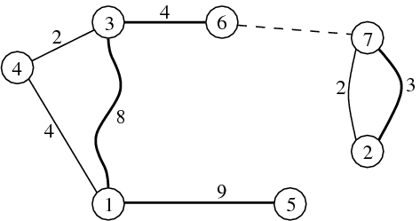 bridges in the sample are (1-3), (2-7), (3-4), (4-1), (5-1), (6-3) and (7-2). Note that there are two different bridges connecting islands 2 and 7.